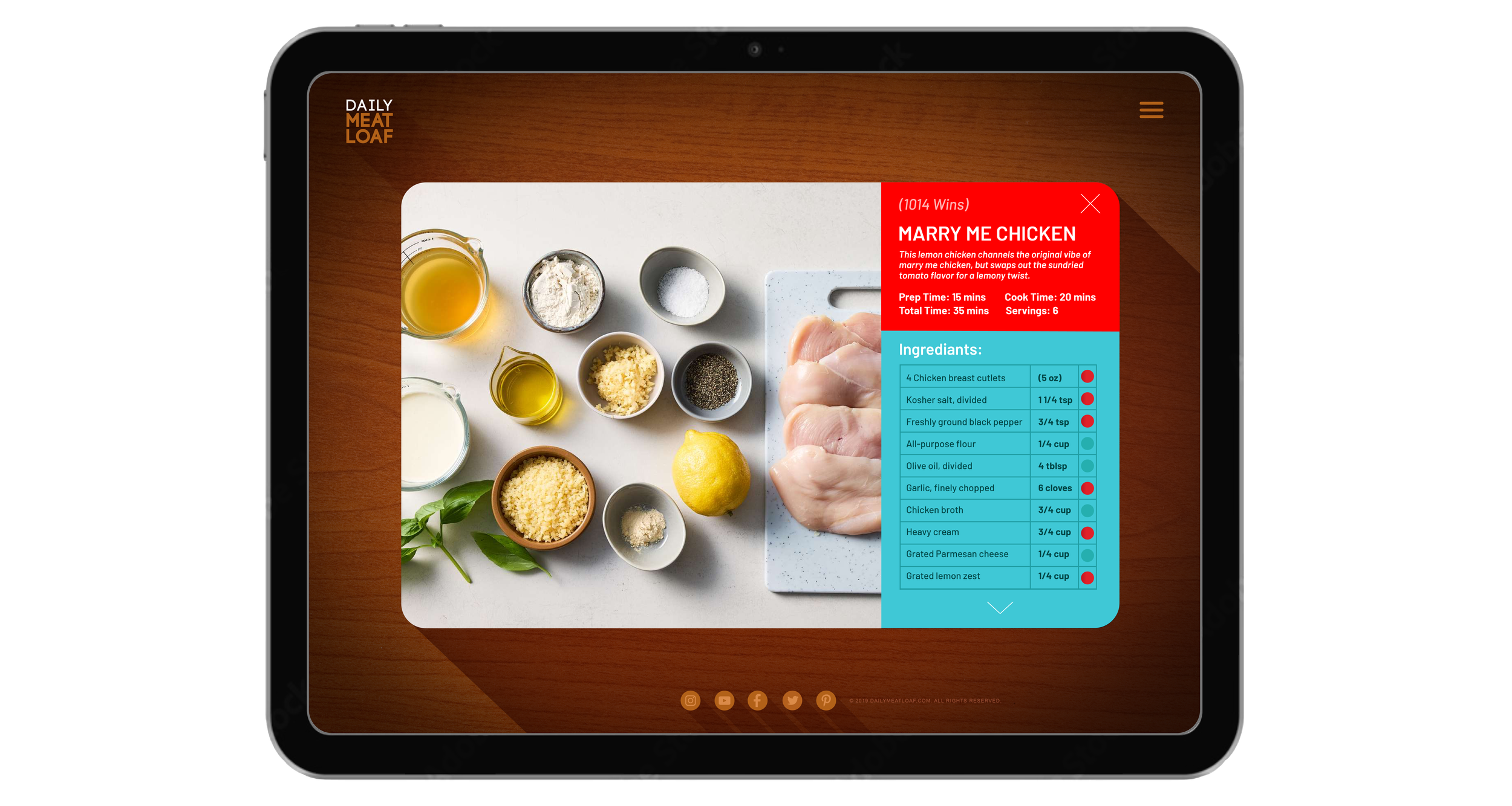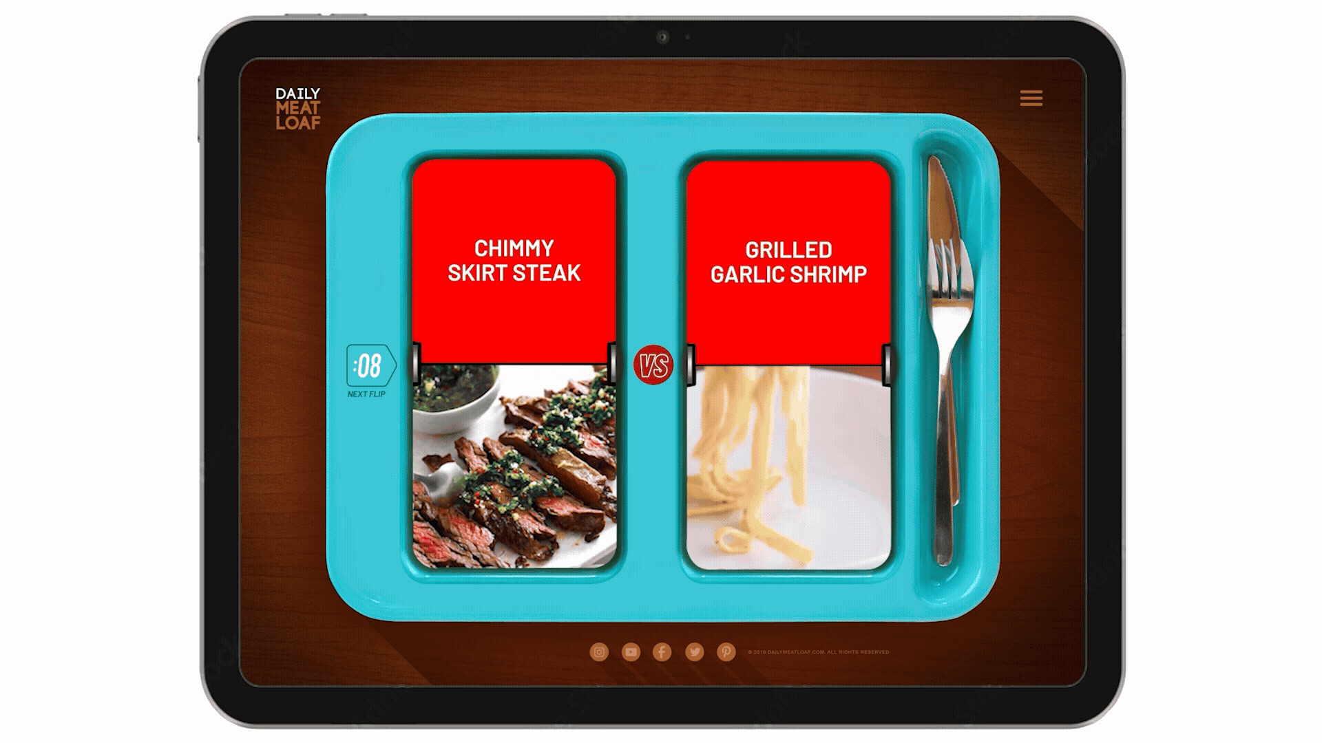 The Daily Meatloaf brand was building a Foodie app focused for the iPad. A creative strategy was developed to engage these passionate food experience junkies by exploring food in a fun setting. A challenger-model was crafted where two opposing recipes would face-off every 8 seconds. The viewer chooses a recipe (winner) or simply waits for the next flip of challengers. Once a recipe is selected additional content brings the viewer through each step of that particular recipe with food preparation and culinary techniques.